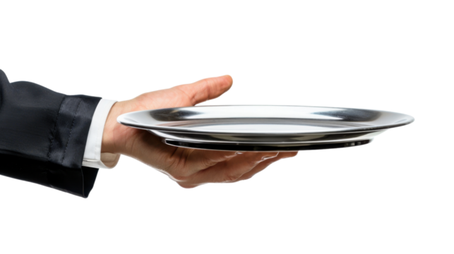 Hand holding silver tray waiter butler service isolated on transparent background