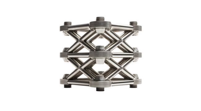 A metal lattice structure with a complex geometric design on a transparent background