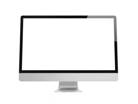 A sleek silver computer monitor with a blank white screen isolated on transparent background