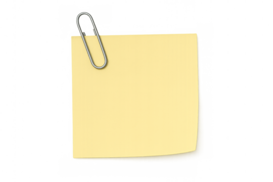Yellow sticky note with red paper clip PNG isolated on transparent background, reminder message for office and personal use