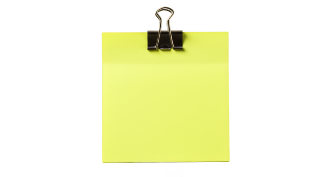 Yellow sticky note paper fastened by golden paperclip, floating against transparent surface, highlighting clean minimalist communication concept