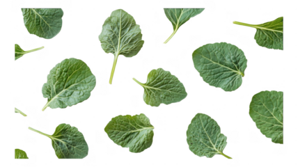 Fresh green leaves arranged transparently against a white background for a vibrant composition