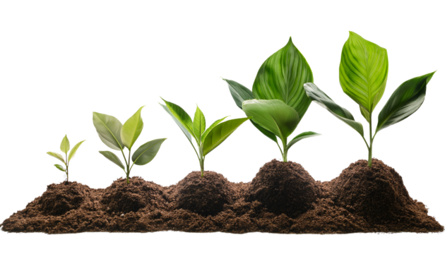 Five stages of plant growth displayed with rich green leaves and brown soil.