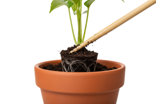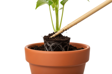 Small green seedling being transplanted into clay pot with wood tool on a transparent background