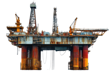 Offshore drilling platform stands isolated in the ocean with rust and machinery against a white background