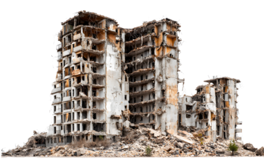 Devastated apartment building stands as stark symbol of war and destruction, highlighting urban decay