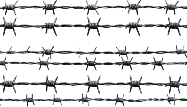 Three parallel strands of dark, sharp, metallic barbed wire against a stark, black background