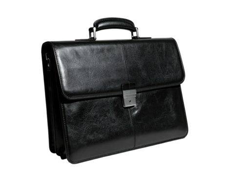 A sleek, black leather briefcase with a silver clasp and handle, on a neutral background