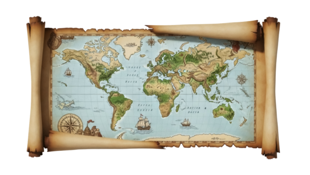 Isolated antique world map scroll with vintage parchment, a treasure map for exploration