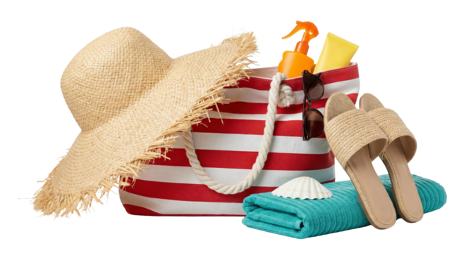 A beach bag filled with summer essentials. It includes a straw hat, colorful towel, sunscreen bottles, and blue flip-flops. All items are on a transparent background.