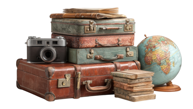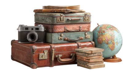 Stacked vintage suitcases, books, globe, and camera