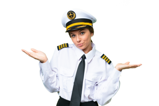 Airplane pilot woman over isolated chroma key background having doubts while raising hands