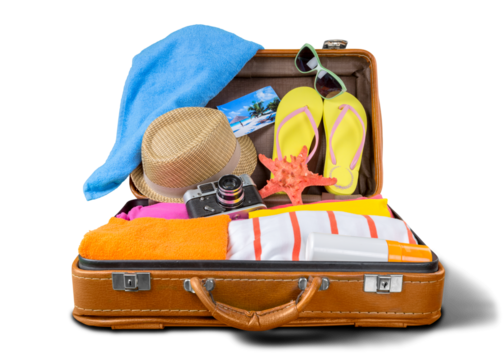 Set of travel suitcases, blue, yellow, red and black isolated on transparent background