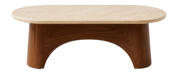 Top and side views of a curved coffee table with travertine top and wooden base.