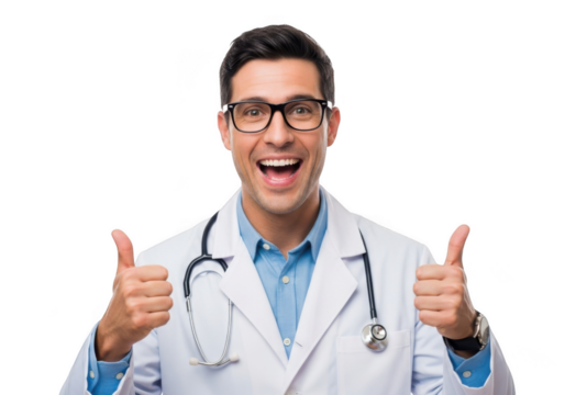 Trustworthy doctor gives thumbs up gesture, conveying confidence and approval for healthcare, medicine, and wellness initiatives, ideal for medical marketing