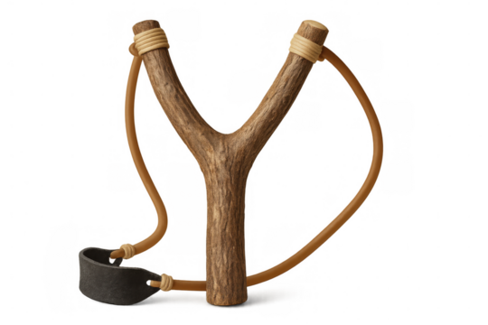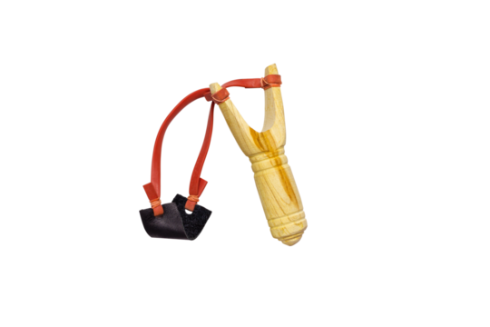 Classic wooden slingshot with leather thongs, isolated on transparent background, ready for launching projectiles