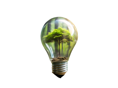 Transparent light bulb illustration with tree inside symbolizing eco-friendly ideas