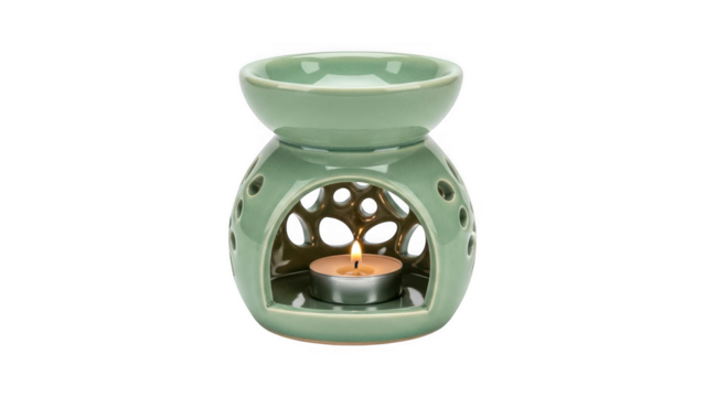 Green ceramic oil burner with lit candle inside isolated on transparent background