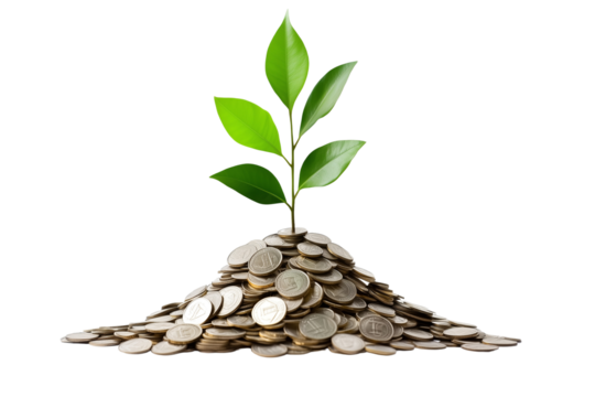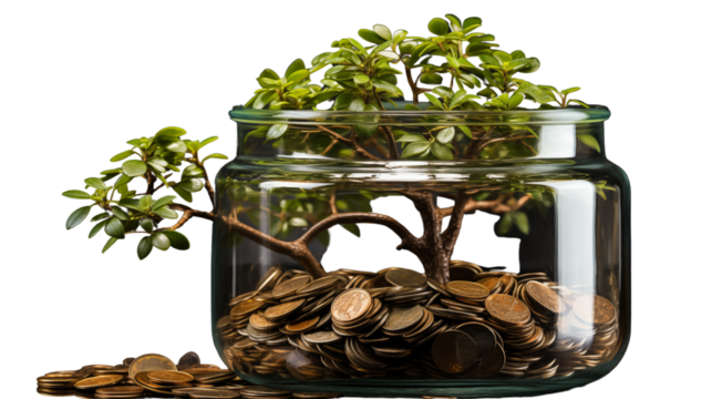 Creative depiction of a coin-filled jar with a tree sprouting, representing financial growth, isolated on transparent background.