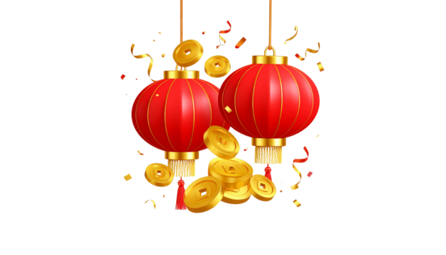 Chinese New Year decorations, red lanterns and bright gold coins on a white background