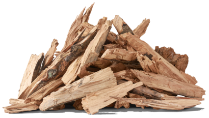 pile of chopped firewood pieces, seasoned hardwood prepared for use as fuel in fireplaces, wood stoves or outdoor fire pits, common source of heat and energy, isolated on white background
