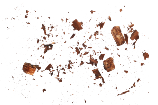 Rotten, old wood pieces and dust, scattered crushed tree bark isolated on white