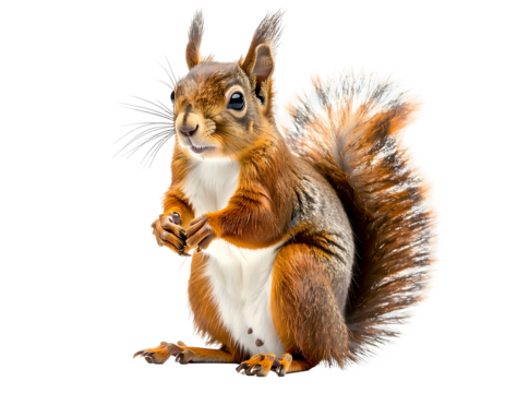 Fluffy squirrel poses holding a nut against a white background