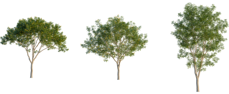 Libidibia ferrea tree, front view, cutout, transparent background, isolate, Three different trees with lush green foliage on a transparent background.