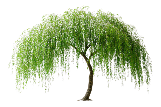 A lush weeping willow tree with long, graceful branches and vibrant green leaves background removed