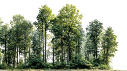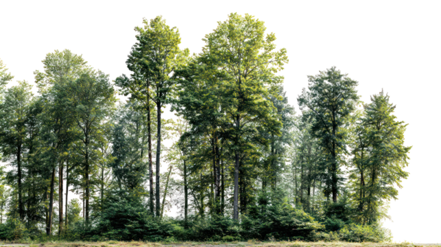 A cutout image of a lush forest edge featuring a mix of tall trees and green shrubbery isolated on transparent background