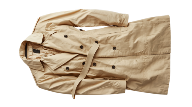 Khaki trench coat with belt on a transparent background, representing timeless fashion, weather protection, and style