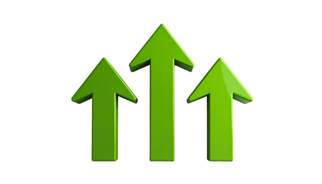 Green arrows rising showing increasing growth, business improvement, financial success, and upward progress on transparent background