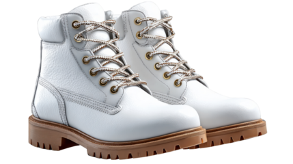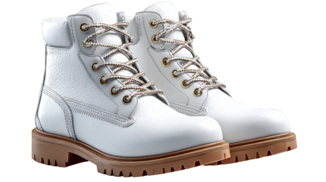White Leather Boots: These sturdy white leather boots, with their robust design and intricate detailing, exude a blend of practicality and style.