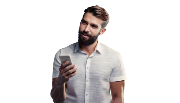 Smiling Young American Man Using a Digital Tablet with Cheerful Expression, isolated on a transparent background, PNG