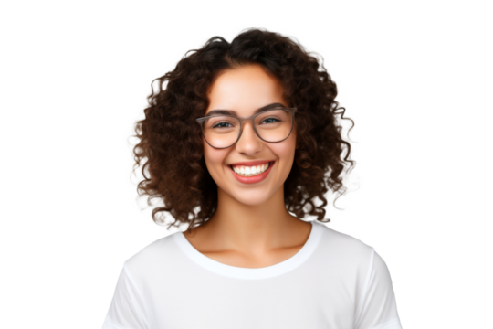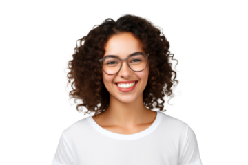 Smiling woman with glasses in white blouse on transparent background