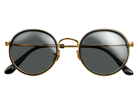Black-framed eyeglasses with blue and red arms, isolated on black background