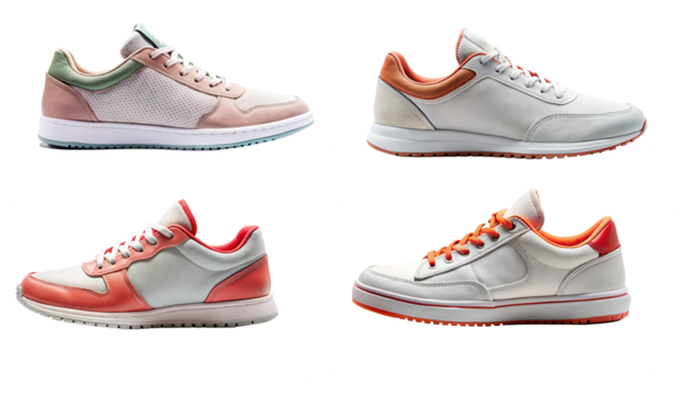 Four Stylish Sneakers With Orange Accents, Cut Out.