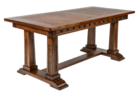 A large antique-style wooden trestle dining table with a rectangular top and sturdy carved legs, isolated on a simple white background