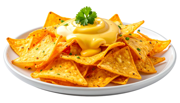A plate of tortilla chips, covered in melted cheese, garnished with parsley