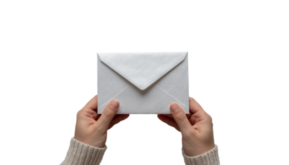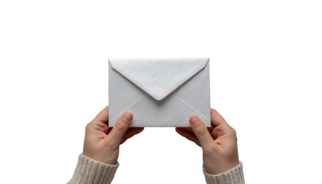 Hands holding a white envelope with a triangular flap, centered in the frame, against a plain solid white background and no background