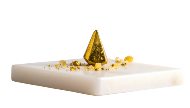 A golden, triangular object rests on a white, rectangular block, scattered with golden granules. The background is black