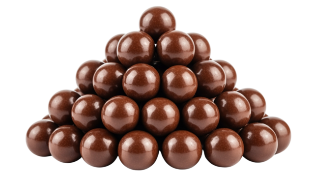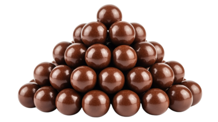 A triangular stack of numerous, uniformly sized, shiny chocolate-coated spheres against a solid black background. The arrangement creates a pyramid shape