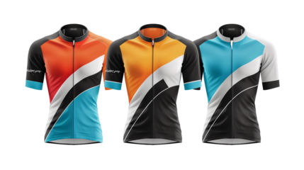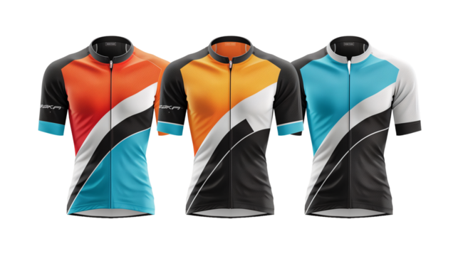 Sleek black, blue and orange cycling jersey with stripe design, perfect for athletes. Cycling Jerseys mockup t-shirt sport. PNG Transparent background.