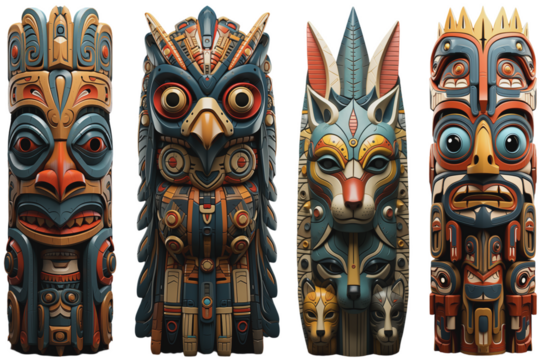 different indian colorful and artfully crafted totem poles on a transparent background, Generative AI