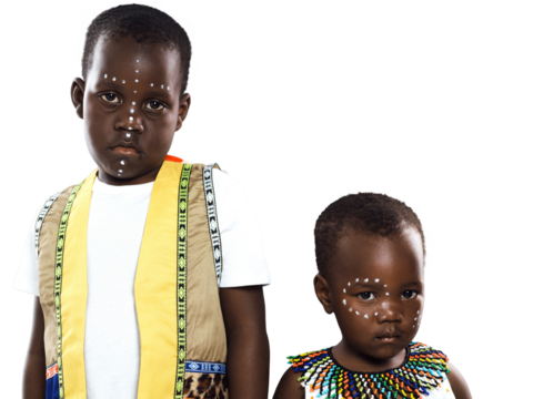 Black children, portrait and face paint for tribe, Africa or culture tradition isolated on a transparent PNG background. Young African kids, model or boys in traditional fashion, style or clothing