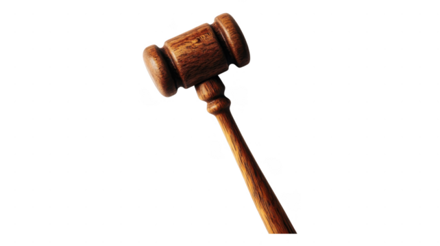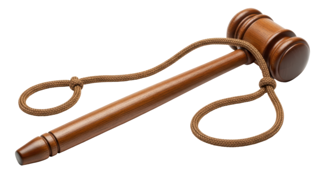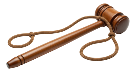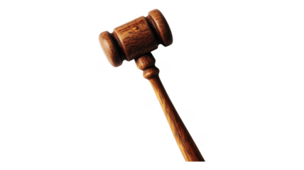 A dark wooden gavel isolated on transparent background, representing the power and impartiality of the legal system in a court of law