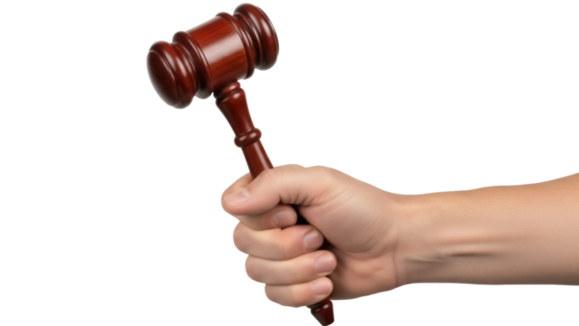 A wooden gavel with golden accents, held by a suited hand, epitomizing fairness, authority, and the weight of legal decisions. Isolated on a transparent background