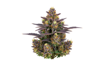 Isolated bud of vibrant cannabis plant with purple leaves, rich orange pistils & trichomes