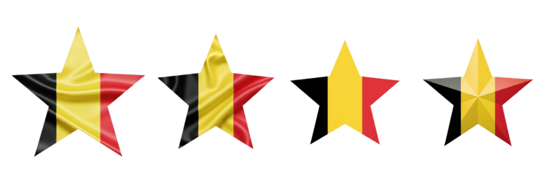 Set of four Belgium flag stars, patriotic national symbols, Belgium star shape decorations, isolated on white background, 3D render, holiday PNG.