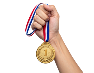 Hand holding a first place gold medal with a tricolor ribbon. Isolated on transparent background, png